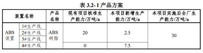 本次计划新增一条 4#生产线,4#生产线的生产能力仍为 7.5 万吨/a。同时将现有 3 条生产线的核准生产量提高至装置的设计生产能力。本项目实施后,全厂 ABS 的生产能力达到 30 万吨/a。