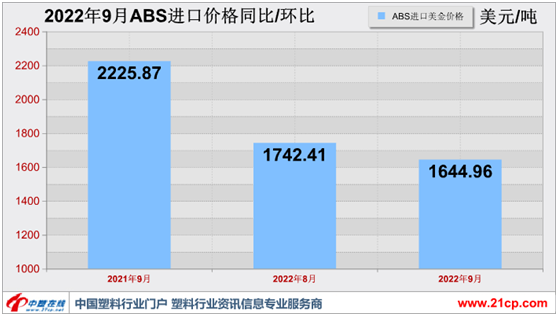 2022年9月ABS进口均价1644.96美元/吨,同比下跌580.91美元/吨,跌幅26.10%;环比下跌97.45美元/吨,跌幅5.59%。