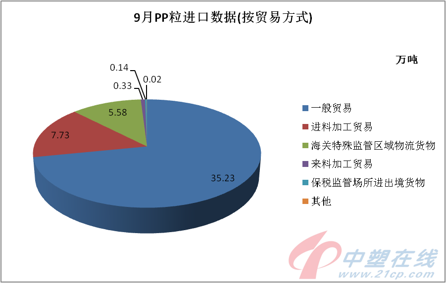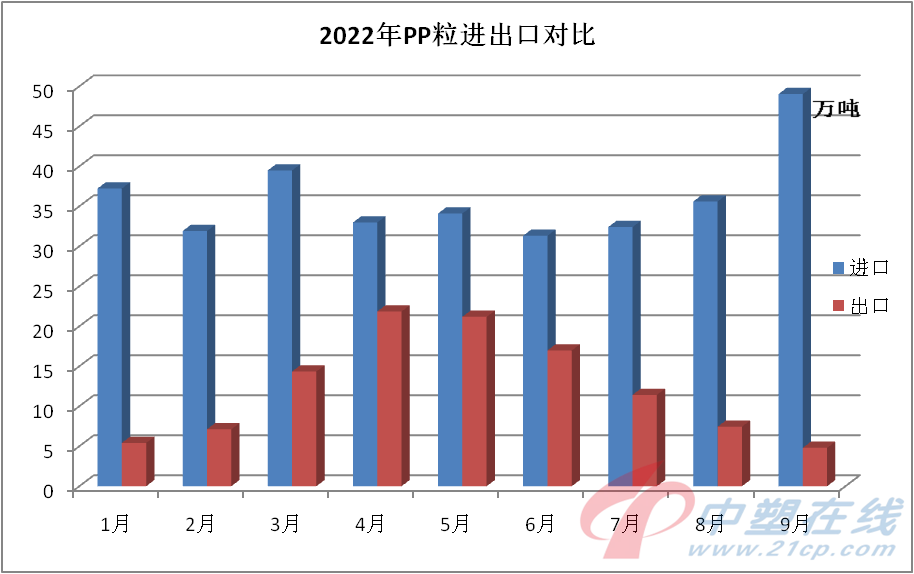 9月份,外贸市场形势严峻复杂,PP粒进出口一增一减。据海关统计数据显示,进口量为49.03万吨,环比增加37.69,同比增加28.08%,创本年度新高。而出口量仅为4.8万吨,环比减少35.57%,同比减少29.72%。