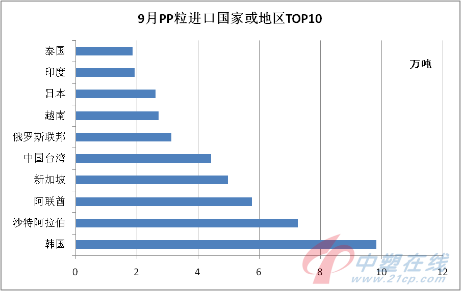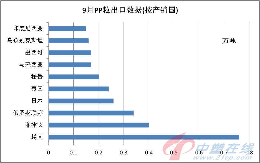 9月份越南重回最大来源国地位,在出口量大幅锐减的情况下,当月增加0.18万吨至0.76万吨,占比15.83%;菲律宾前进一名,占比8.33%,环比减少0.2万吨;俄罗斯联邦首次挤进前三,占比7.05%,环比增加0.09万吨。