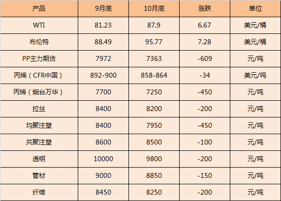 十月份,国内PP市场以惊艳开场、却惨淡收尾,真是让人唏嘘.……。国庆期货原油暴涨近15%,然而“开门红”行情仅昙花一现,由于主力期货不断向下探底,对现货心态形成较大压抑,同时不少石化企业下调出厂价,成本支撑作用减弱的同时,也为场内增添许多不安情绪。而最最重要的是,下游用户采购热情始终难提升,成交压力未能有效释放,促使贸易商唯有降价以寻求成交支撑,从而令市场重回萎靡不振的状态。