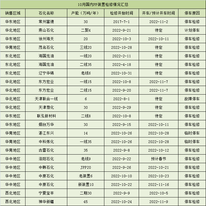 10月份PP装置检修淡季来临,共计19家生产厂家、24条生产线停车检修,涉及产能约443万吨/年。