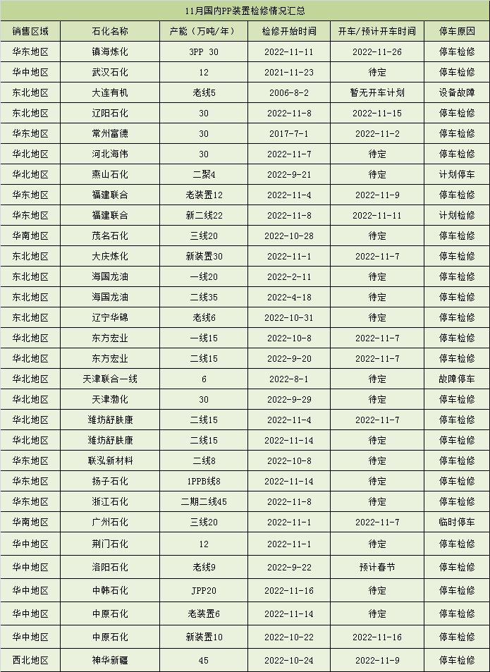 11月份检修装置主要分布于华东、华南、华北、华中地区,潍坊舒肤康二线在月初短暂停车两三天后,于11月14日二次停车,重启时间待定;中原石化新装置提前开车,历时一个月;洛阳石化老线检修时间较长,预计在春节前后重启;随着优化疫情防控工作二十条措施的利好释放,市场心态得到提振,不过小编已知年底仍有新装置(广东石化、海南炼化、东莞巨正源等)相继投产预期,供应压力增加,从而导致价格难跟进利好消息,预计走势呈偏弱震荡。