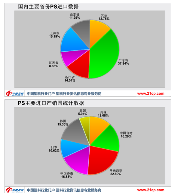 从各省方面的进口数据可以看出华东、华南地区是全国最大的进口PS通关区域。10月占到总进口量超8成。其中广东省进口2.62万吨,约占37.94%;上海市进口1.05万吨,约占15.19%;浙江省进口0.97万吨,约占14.01%;江苏省进口0.61万吨,约占8.83%;山东省进口0.78万吨,约占11.29%。