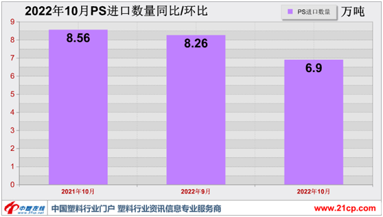 2022年10月份,中国PS出口约1.01万吨,环比增加0.17万吨,增幅为20.24%。2022年1-10月,中国PS累计出口约9.48万吨,同比增加3.76万吨,增幅65.73%。