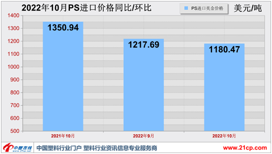 2022年10月PS进口均价1180.47美元/吨,同比下跌170.47美元/吨,跌幅12.62%;环比下跌37.22美元/吨,跌幅3.06%。