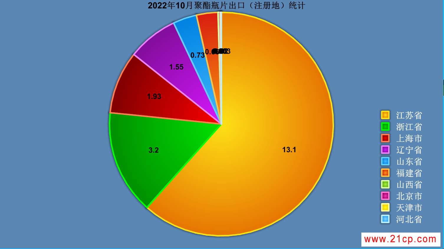由图2可见,2022年10月聚酯瓶片前两位出口注册地主要省份不变,江苏省仍为我国聚酯瓶片出口排名的第一省份,10月份出口量为13.1万吨,占国内总出口量的46.22%。较上月环比增加10.36%,较去年同比减少10.21%。浙江省保持第二,出口量为3.2万吨,占比为11.29%;上海市位居第三,出口量为1.93万吨,占比为9.07%;辽宁省居于第四,出口量为1.55万吨,占比为6.81%。