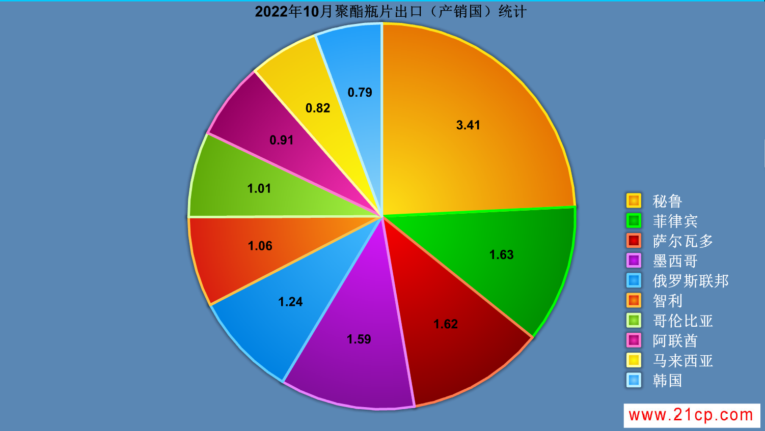 由图1可见,2022年10月聚酯瓶片前十位出口国有所变动,主要出口国以南美洲、亚洲、北美洲等地区为主。其中秘鲁取代阿尔及利亚,位居第一,出口量为3.41万吨,环比上月增加2.28万吨,占比为12.03%;菲律宾上升到第二位,出口量为1.63万吨,环比上月减少0.19万吨,占比为5.75%;萨尔瓦多居于第三位,出口量为1.62万吨,环比上月减少0.92万吨,占比为5.72%。