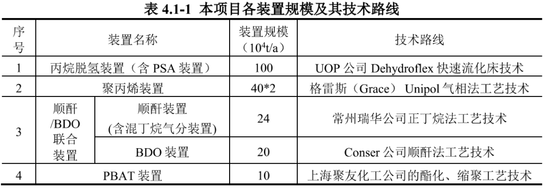 本项目各装置设计规模及工艺路线与总体产品方案如下表所示。从表中可以看到,公司PDH装置计划采用UOP公司技术,PP装置计划采用格雷斯Unipol气相法工艺。