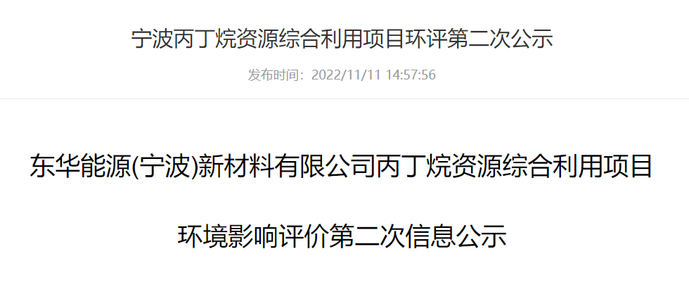 近期,东华能源(宁波)新材料有限公司丙丁烷资源综合利用项目,进行环境影响评价第二次信息公示。