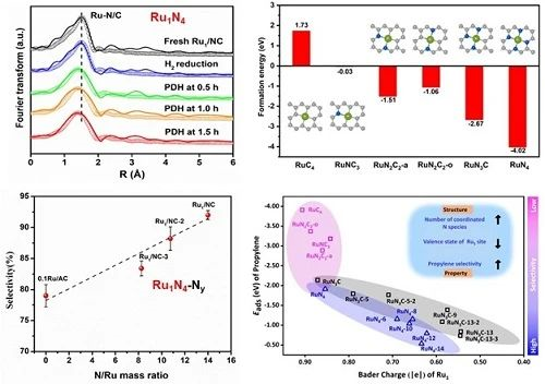本工作中,研究人员开发了一种高效稳定的氮掺杂碳负载的Ru单原子催化剂(Ru1/NC)用于高温丙烷脱氢制丙烯反应。Ru1/NC相比于Ru纳米催化剂具有更高的丙烷脱氢活性、选择性和稳定性,其性能与工业PtSn/Al2O3催化剂相当。原位XAFS实验发现在高温反应气氛条件下,Ru1/NC中Ru1N4配位结构没有发生改变,表明内壳层N配位的Ru1位点具有良好的稳定性。在此基础上,团队通过调控外壳层氮含量,发现随着外壳层氮含量的增加,丙烯选择性相应增加。DFT理论计算进一步表明Ru单原子形成能随内壳层Ru-N配位数增加而降低,说明内壳层的氮物种对稳定Ru1位点具有重要作用。而外壳层的氮物种可以传递电子给Ru1中心,降低丙烯的吸附能,进而提高丙烯选择性。因此,Ru单原子内外壳层氮物种的共同作用实现该单原子催化剂丙烷高效脱氢生成丙烯。