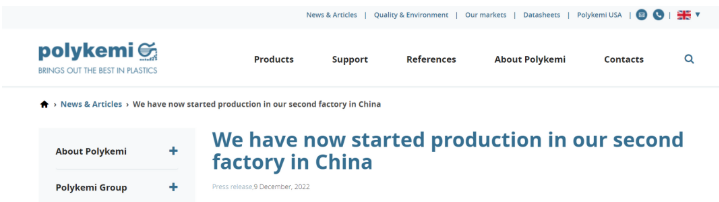 自2005年以来,位于上海附近的江苏昆山柏力开米复合材料有限公司(Polykemi Compounds Kunshan)一直在中国市场占据强势地位。从2015年开始,姐妹公司Scanfill AB和Rondo Plast AB也在昆山生产。