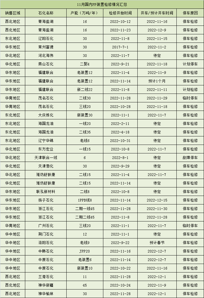 11月份PP装置检修只增不减,共计25家生产厂家、31条生产线停车检修,涉及产能约663万吨/年。