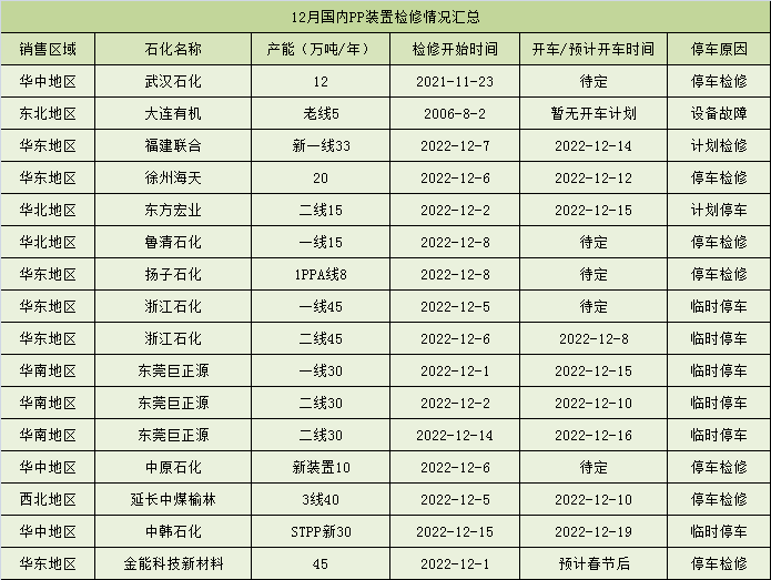 据小编了解到,12月前期停车检修装置多为临时故障停车,目前已有部分陆续开车;近期看,开放疫情管控限制后,对口罩等防护需求加大,PP市场出现阶段性的小幅走强。后续来看,临近年末新增检修装置不多,整体供应量呈现增加趋势,供应端对行情支撑有限。下游需求在口罩行情带动下,相关原料涨势明显,工厂面临成本上涨压力,遇新增订单量无法及时跟进下,或部分工厂将提前放假。