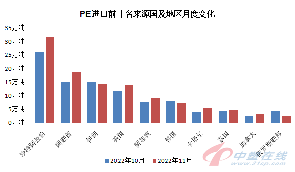 2022年11月聚乙烯进口来源国前十位占比位次稍有变动。沙特阿拉伯仍居第一,进口总量为31.62万吨,环比增加21.94%,占比24.95%;阿联酋第二位,进口总量为18.82万吨,环比增加25.97%,占比14.85%;第三位为伊朗,进口总量为14.35万吨,环比减少5.47%,占比11.33%。四到十位分别是美国、新加坡、韩国、卡特尔、泰国、加拿大和俄罗斯联邦。