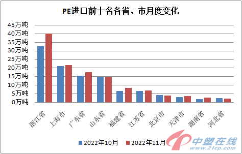 11月,我国进口聚乙烯按注册地统计,第一名依然是浙江省,进口量40.04万吨,占比31.60%;上海市第二,进口量为21.59万吨,占比17.04%;广东省第三,进口量为17.61万吨,占比13.90%;山东省第四,进口量为14.54万吨,占比11.48%;福建省、江苏省、北京市、天津市、湖南省以及河北省分列第四至十位。