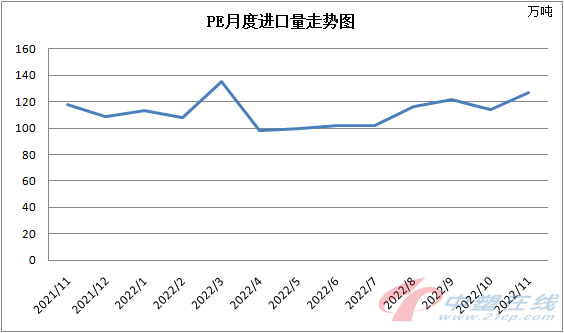 据海关统计,2022年11月我国聚乙烯当月进口量在126.71万吨,环比增加11.14%,同比增加7.85%。其中LDPE(税则号39011000)进口约27.88万吨,环比增加10.11%,同比增加12.78%;HDPE(税则号39012000)进口约52.2万吨,环比增加4.80%,同比减少5.98%;LLDPE(税则号39014020)进口约46.63万吨,环比增加19.93%,同比增加25.18%。1-11月累计进口量为1237.51万吨,同比增加7.84%。11月聚乙烯进口量有所增长。一方面受宏观消息面提振,场内心态好转,市场成交尚可;另一方面,外美联储放缓加息预期进一步消化,人民币兑美元走强,随着进口资源船期陆续到港,进口套利窗口扩大,进口量增量。
