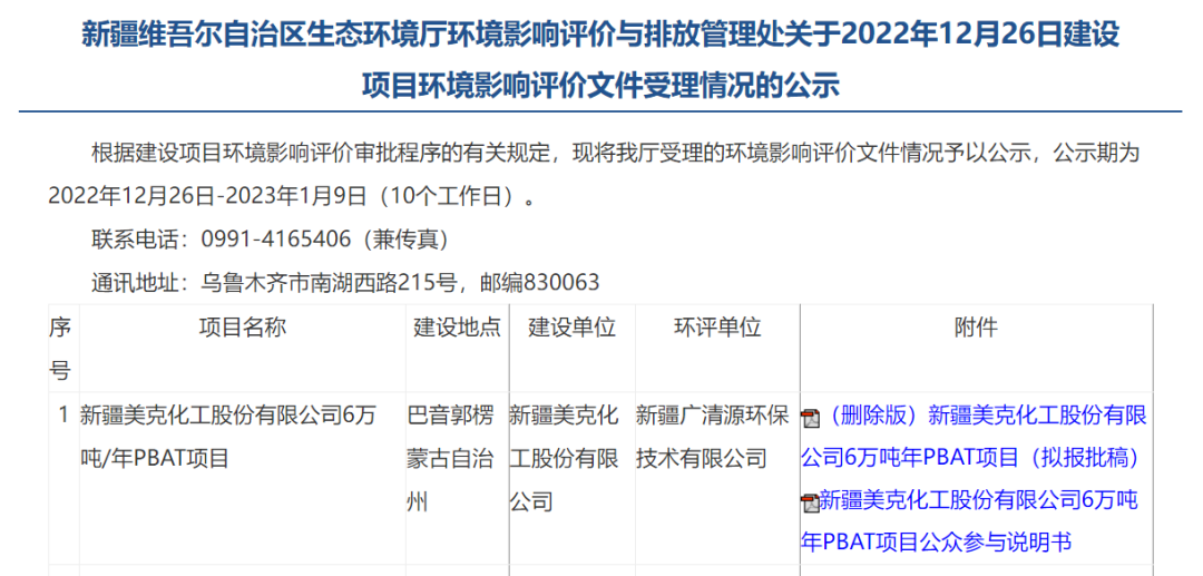 2022年12月26日,新疆维吾尔自治区生态环境厅将受理的“新疆美克化工股份有限公司6万吨/年PBAT项目”环境影响评价文件情况予以公示。示期为2022年12月26日-2023年1月9日(10个工作日)。