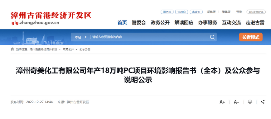 12月27日,漳州古雷港经济开发区发布了漳州奇美化工有限公司年产18万吨PC项目环境影响报告书(全本)及公众参与说明公示。