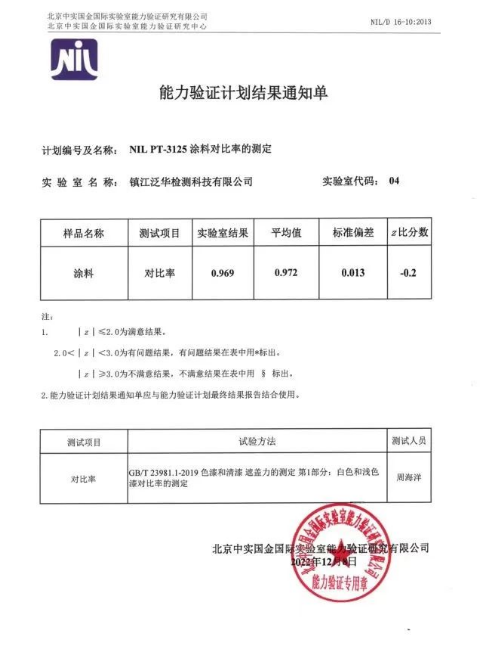 近日,镇江泛华检测科技有限公司通过了由北京中实国金国际实验室能力验证研究公司组织的本年度NIL-PT-3125“涂料对比率的测定”能力验证,顺利获得了“能力验证满意证书”。