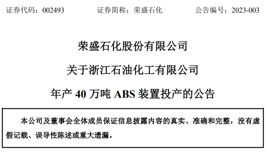1月16日晚,荣盛石化发布浙石化年产 40 万吨 ABS 装置投产的公告。