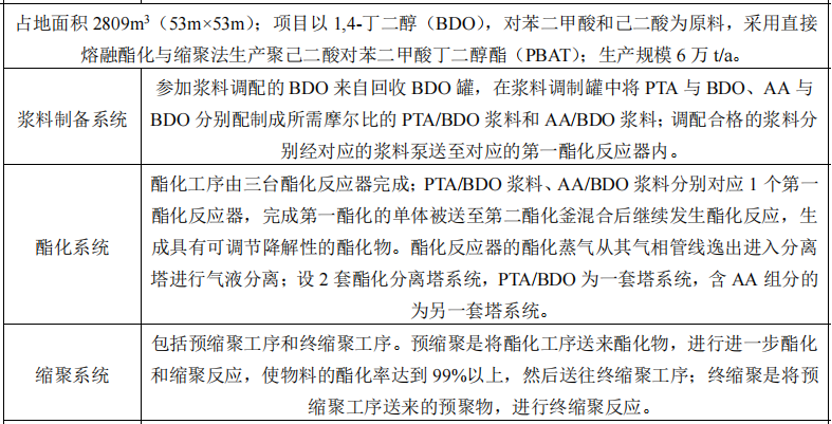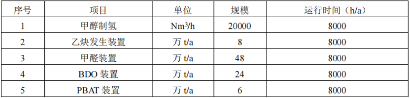 建设内容:本项目通过干法乙炔装置制取乙炔,甲醇氧化法制取甲醛,进一步通过炔醛法生产1,4-丁二醇(BDO),同时配套甲醇制氢装置,为项目提供氢气;以 BDO、对苯二甲酸(PTA)、己二酸(AA)为原料,采用熔融酯化与缩聚法生产聚己二酸对苯二甲酸丁二醇酯(PBAT)