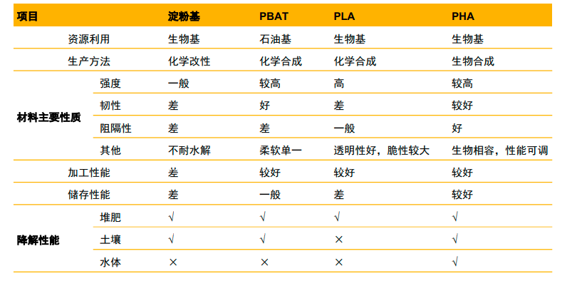 此外,相较于改性淀粉、PBAT、PLA等可降解材料,PHA综合性能更好,数据对比情况见下图。