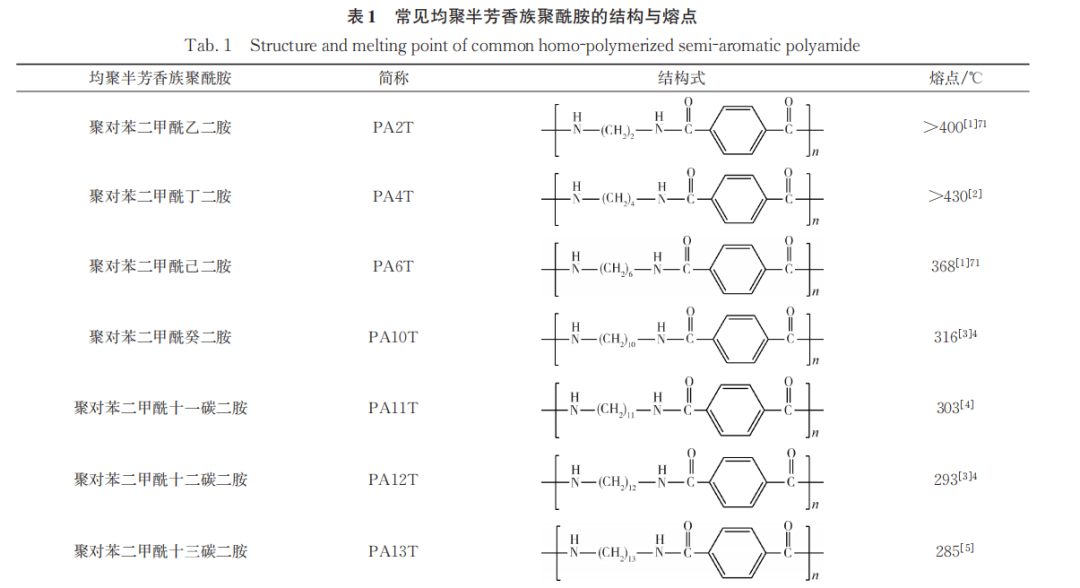 半芳香族尼龙按树脂类型可分为均聚半芳香族尼龙和共聚半芳香族尼龙。均聚半芳香族尼龙成分确定,普遍具有较高的结晶度,特别适合纤维制造。下表为常见均聚半芳香族尼龙的结构与熔点。