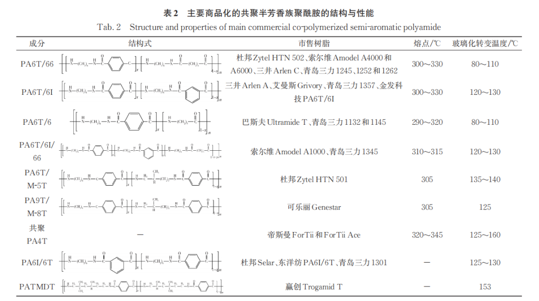 PA4T 同样由于熔点太高,需引入共聚单体降低树脂熔点。聚对苯二甲酰壬二胺(PA9T)则是因为原料二胺为混合二胺,不分离直接聚合得到PA9T共聚物。下表为主要商品化共聚半芳香族尼龙的结构与性能。