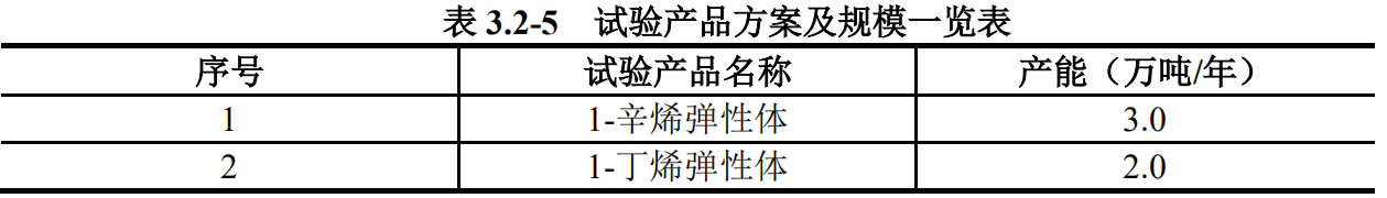本试验装置年运行时间为 8000 小时,主要试验产品为 1-辛烯弹性体、1-丁 烯弹性体。试验产品产能为 5 万吨/年,具体试验方案如下所示: