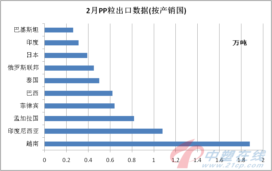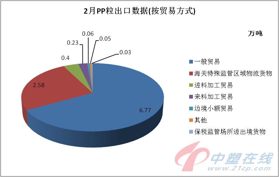 据海关数据显示,2月PP粒出口业绩非常亮眼,同比大增109.52%,为10.12万吨,时隔7个月再创单月新高。其中,初级形状的PP粒出口量为8.79万吨,环比大增119.20%,同比增加31.00%;乙烯-丙烯聚合物的出口量为1.18万吨,环比大增110.71%,同比大增268.75%;其他初级形状的丙烯共聚物的出口量为0.15万吨,环比减少42.31%,同比增加66.67%。