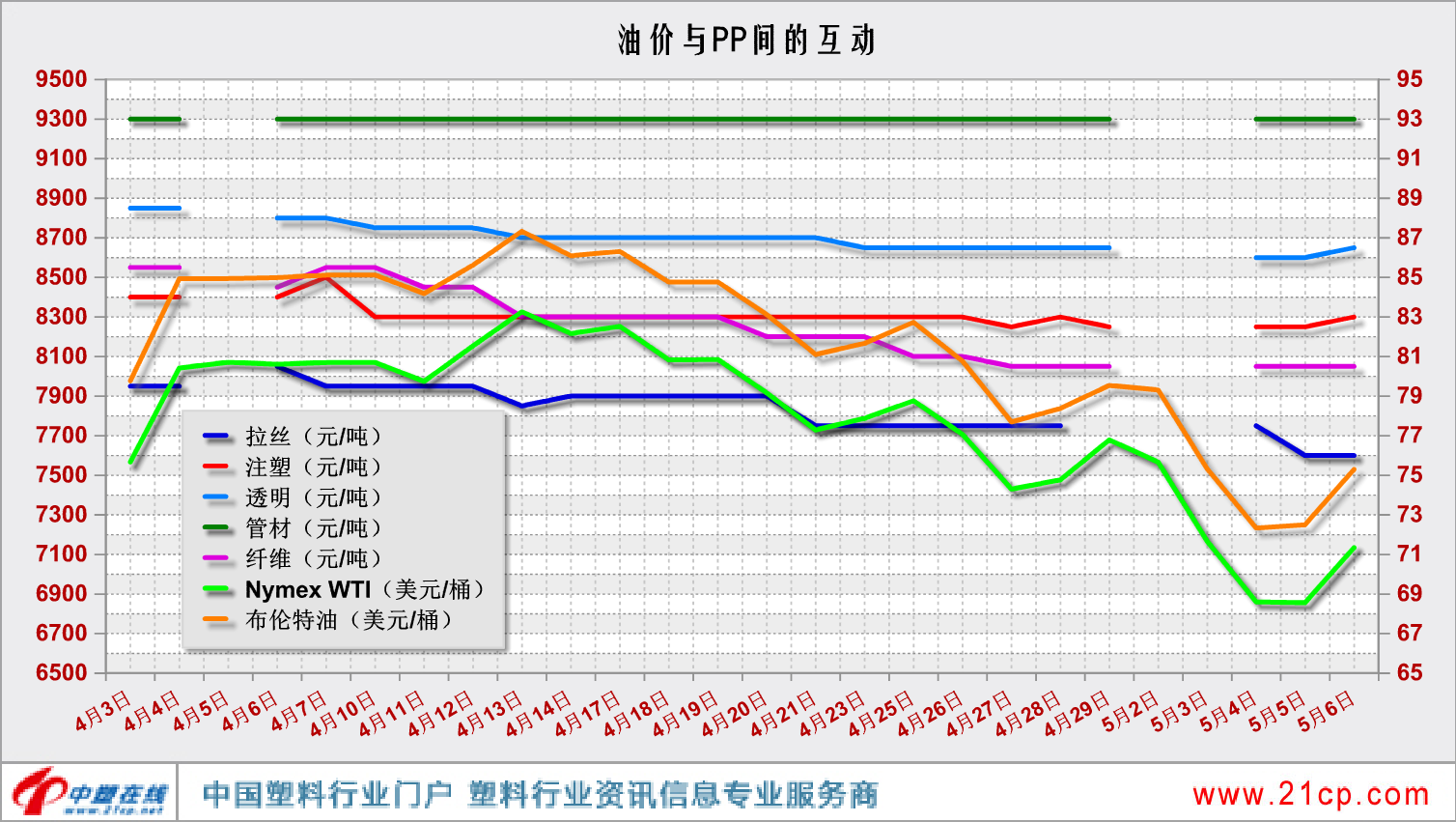 4月以来,国内PP市场走势平淡如水, 不少业内人士在静待契机,然而始终未能如愿。截止当前除了管材走势相对平稳外,拉丝,注塑、透明等均有不同程度的回落,其中跌幅最大的当属纤维,上海赛科S2040下跌450元/吨。依照惯例,在国际原油、单体波动时,势必会带动现货价格丰起伏,可实际走势却恰恰相反,无论上游产品作何调整,市场行情一直举步维艰。