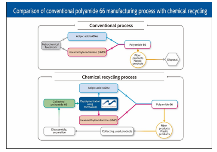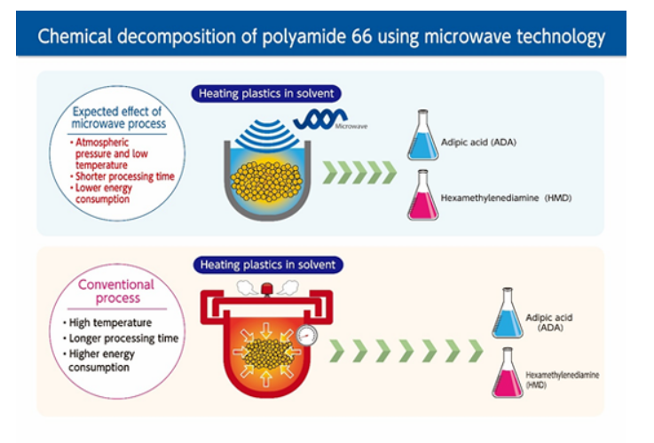 近日,旭化成和Microwave Chemical公司 启动了聚酰胺66的化学回收工艺商业化的联合示范项目,该工艺利用微波对PA66进行低能量解聚,直接得到单体己二胺(HMD)和己二酸(ADA),然后再制造新的PA66。