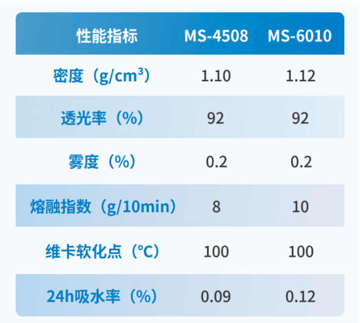 WANCLEATM MS-4508为挤出应用牌号,透光率高,尺寸稳定性好,主要用于大尺寸显示导光板等