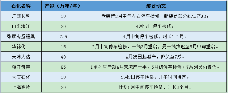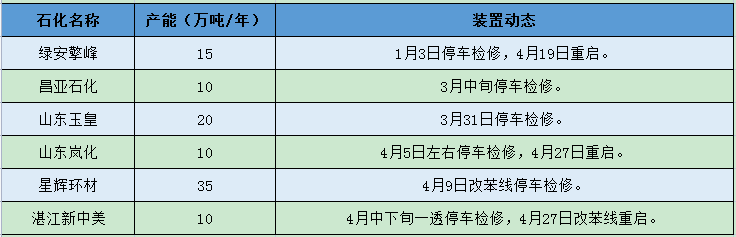从表2来看,4月涉及装置减停产企业与上个月基本变化不大,绿安擎峰、山东岚化装置线已陆续复工,但昌亚石化、山东玉皇、星辉环材、湛江新中美透苯线尚未重启。本月连云港石化装置投产,一定程度弥补了检修带来的损失量。