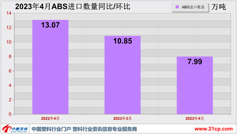 2023年4月中国进口ABS树脂7.99万吨,进口均价1466.59美元/吨。受下游需求表现低迷和社会面库存消化不畅双重影响,ABS进口数据严重缩水,在历史同期中非常罕见。下面中塑小编对4月进口数据做如下简析。