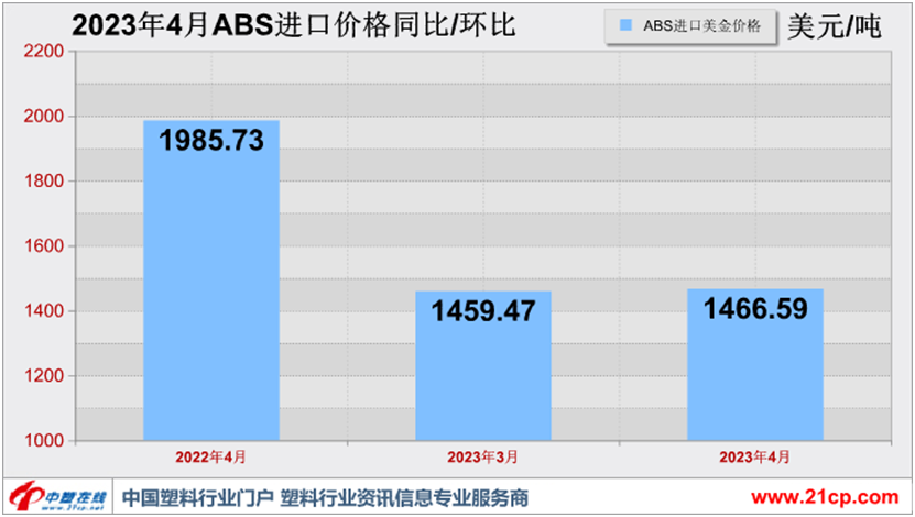 2023年4月ABS进口均价1466.59美元/吨,同比下跌519.14美元/吨,跌幅26.14%;环比上涨7.12美元/吨,涨幅0.49%。