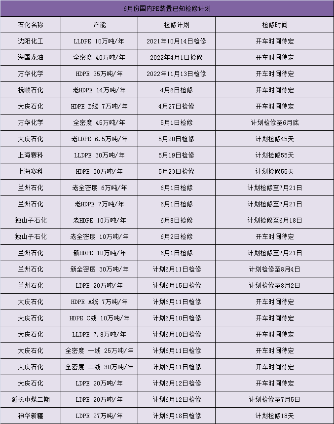 六月PE石化企业大多开启大修计划,检修损失量进一步增加,国内PE供应量减少,但在传统需求淡季下,预计国内PE市场价格弱势盘整仍将是主流。