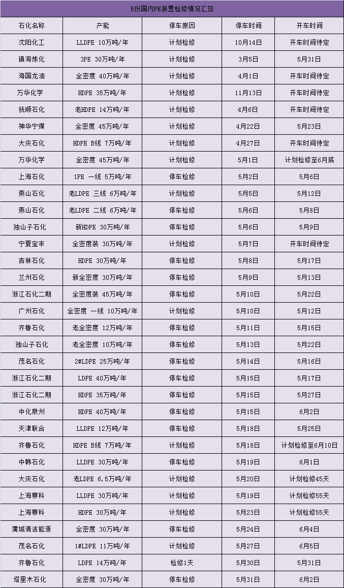 如表1可见,前期停车的其中两家石化企业:镇海炼化3PE装置及神华宁煤全密度装置在本月底前结束检修,正式开车生产。本月新增检修企业中时间较长的有:万华化学HDPE装置计划检修至六月底、宁夏宝丰全密度装置尚未明确具体开车时间、齐鲁石化HDPE装置计划检修至六月初、大庆石化老LDPE装置计划检修四十五天、上海赛科LLDPE装置及HDPE装置均计划检修时间长达五十五天,逐渐进入石化企业集中检修时段。