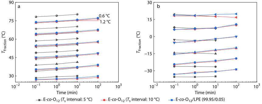 不同条件下,两组分所包括级分的可结晶性(结晶程度利用积分面积定量)也完全不同(图3)。其中,分级窗口的缩小会一定程度上降低体系各级分的结晶程度,但贡献主要来自于Zone I组分;而全温区晶核的引入会有效提高体系各级分的结晶程度,但主要作用于Zone II组分,这进一步印证了两组分结晶行为上的显著差异。随着各阶梯温度退火时间的延长,体系的结晶程度变化不明显,意味着机理上与全温区晶核的作用不尽相同。