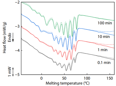中国科学院长春应用化学研究所、中国科学技术大学应用化学与工程学院门永锋研究员课题组设计了一种改进的SSA热分级方法,利用溶液共混的方式将万分之五的线性聚乙烯混入聚烯烃弹性体乙烯-1-辛烯共聚物,为原体系提供全温区范围内有效的晶核,研究表明这种方法可以有效增强晶核在高温退火过程中的作用,分级曲线中各组分的熔点显著增加(图1),从而获得更接近真实序列分布的数据。同时,还发现这种商用乙烯-1-辛烯共聚物是由受分级参数和晶核作用调控后结晶行为完全不同的两种组分(以20℃为临界值)构成。