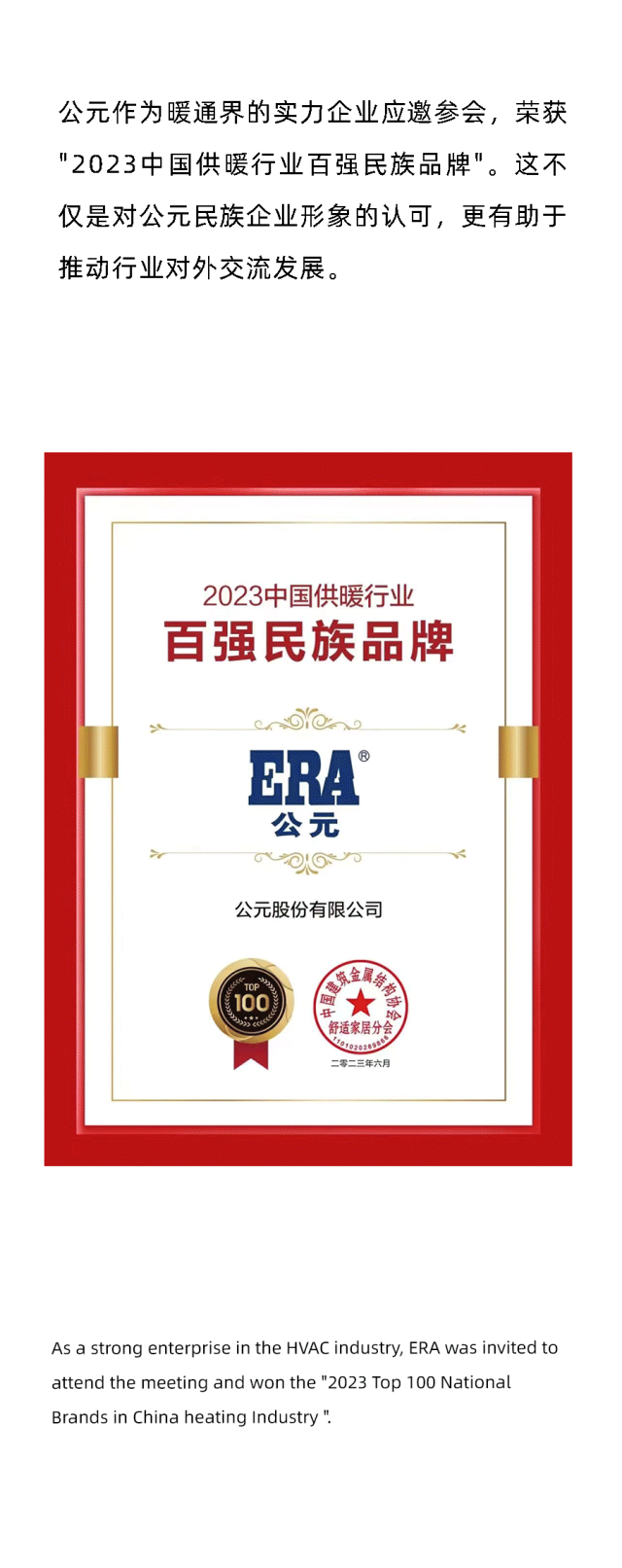 公元荣获2023中国供暖行业百强民族品牌