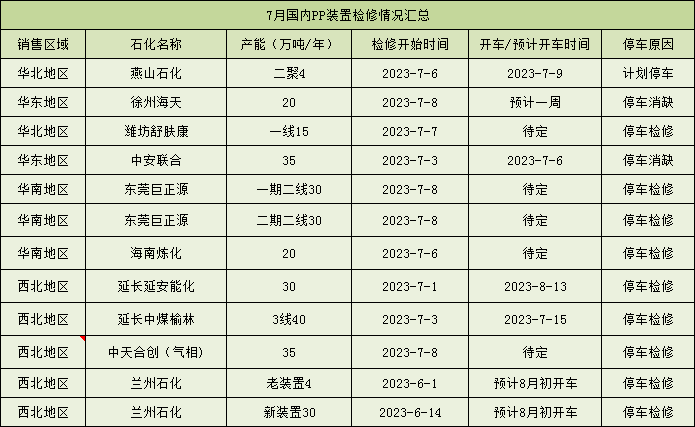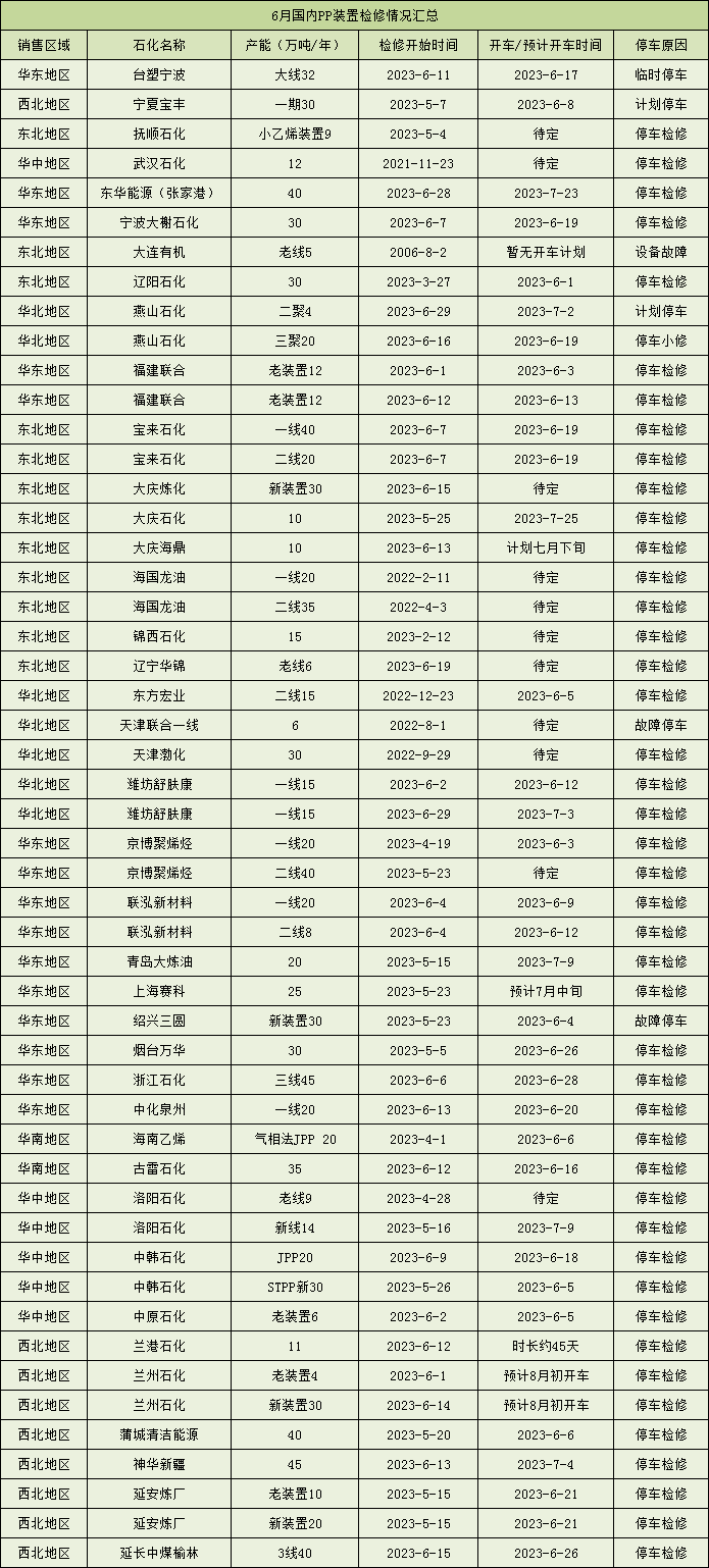 6月份PP装置检修陆续重启,共计40家生产厂家、51条生产线停车检修,涉及产能约1095万吨/年。