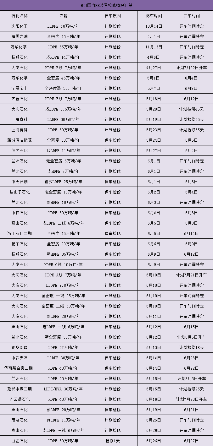 如表1可见,本月石化装置大修企业明显增加,新增检修企业:兰州石化全线装置、大庆石化全线装置均按计划检修,暂未定具体开车时间。神华新疆LDPE装置计划检修十八天,延长中煤二期LDPE/EVA装置计划检修二十五天,连云港石化HDPE计划检修至七月二十日。其余新增检修时间相对较短,月内均已开车生产。