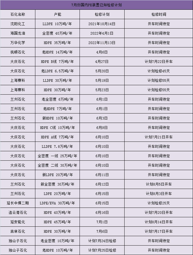 七月PE石化企业检修损失量不减,国内PE供应压力减小,预计对PE市场行情起到支撑作用。