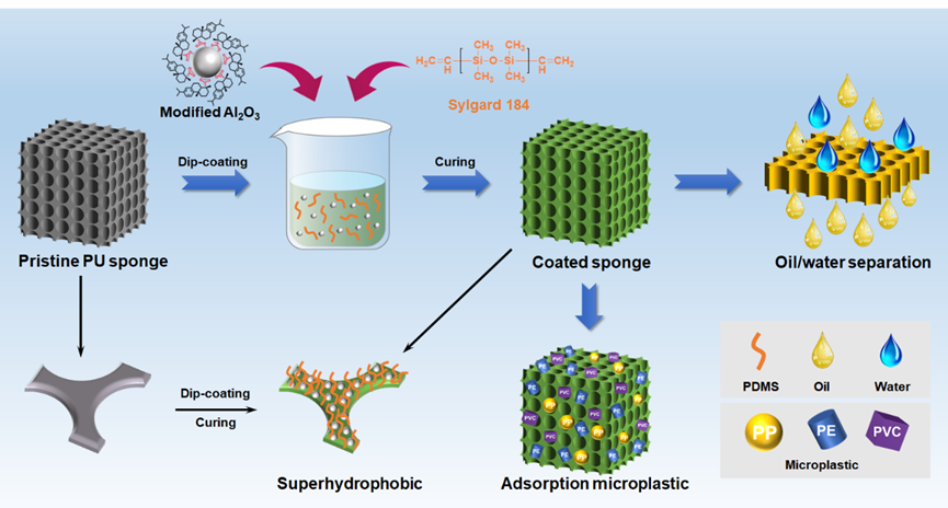 研究人员以聚二甲基硅氧烷(PDMS)和可再生资源脱氢松香改性的Al2O3纳米颗粒为原料,通过浸涂法制备出了一种绿色的超疏水/超亲油聚氨酯海绵。该海绵对不同种类的油具有优异的吸附(吸附能力:20-55 g/g)及再循环(循环20次以上)能力,且可以实现对大量油/水混合物的高效连续分离,分离效率高达97%。此外,该海绵能以较高的速率从水环境中捕获各种尺寸的微塑料,可在几秒内实现水中微塑料聚丙烯(30 μm)、聚乙烯(100 μm)和聚氯乙烯(100 μm,80 nm)的高效吸附,吸附能力分别为0.65 g/g、0.46 g/g、0.59 g/g和0.74 g/g,吸附效率高于99%。