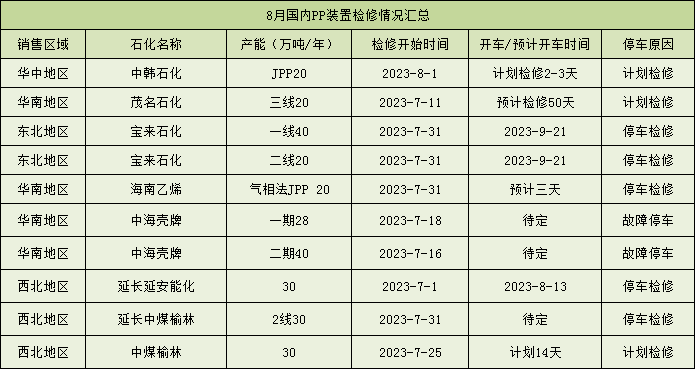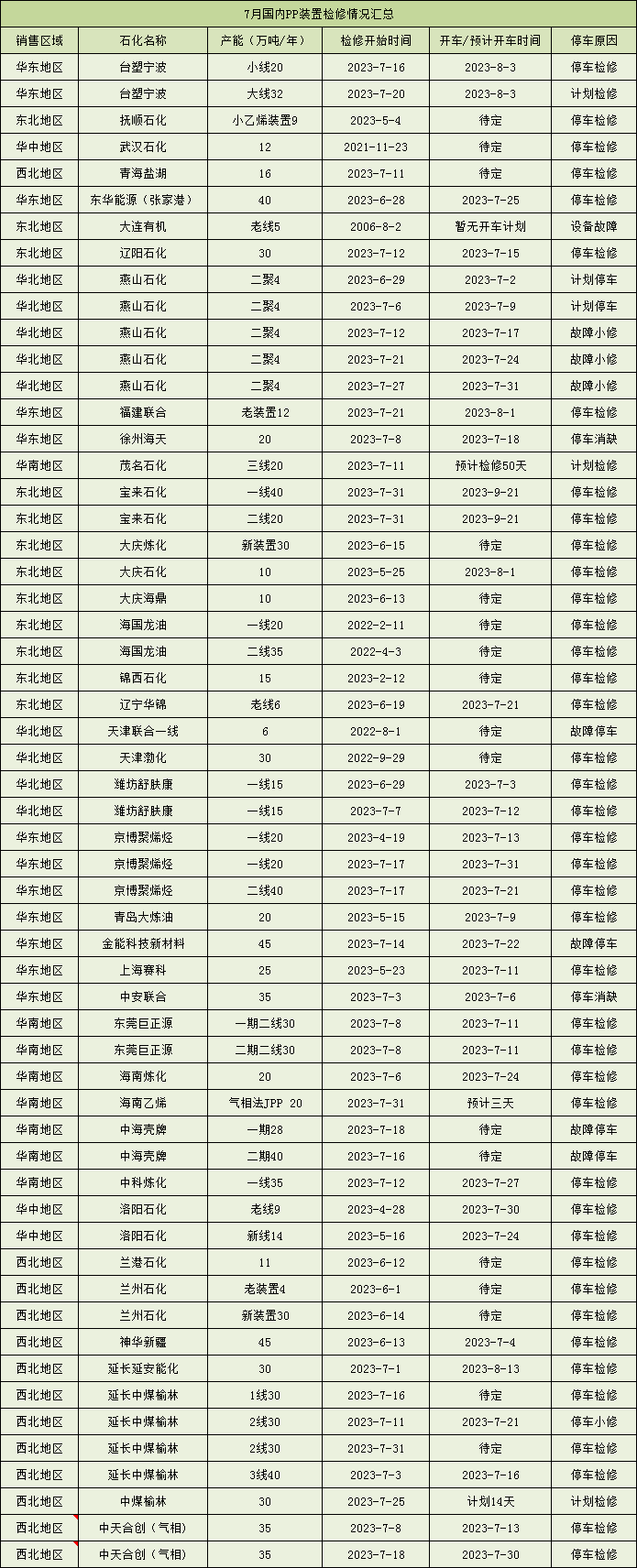7月份PP装置检修集结,共计39家生产厂家、57条生产线停车检修,涉及产能约1269万吨/年。