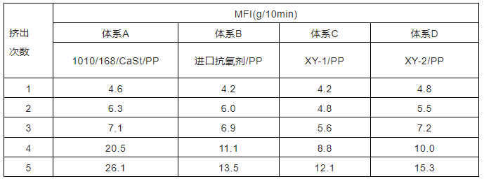 熔融指数是聚丙烯树脂加工性能的一个重要指标,通常用熔融指数法来评价抗氧剂防护的高分子材料的加工稳定性。加工前后熔融指数的变化愈大,材料的加工稳定性愈差。因此考察抗氧剂稳定剂体系经多次挤出后熔融指数的变化。其结果如表1所示。