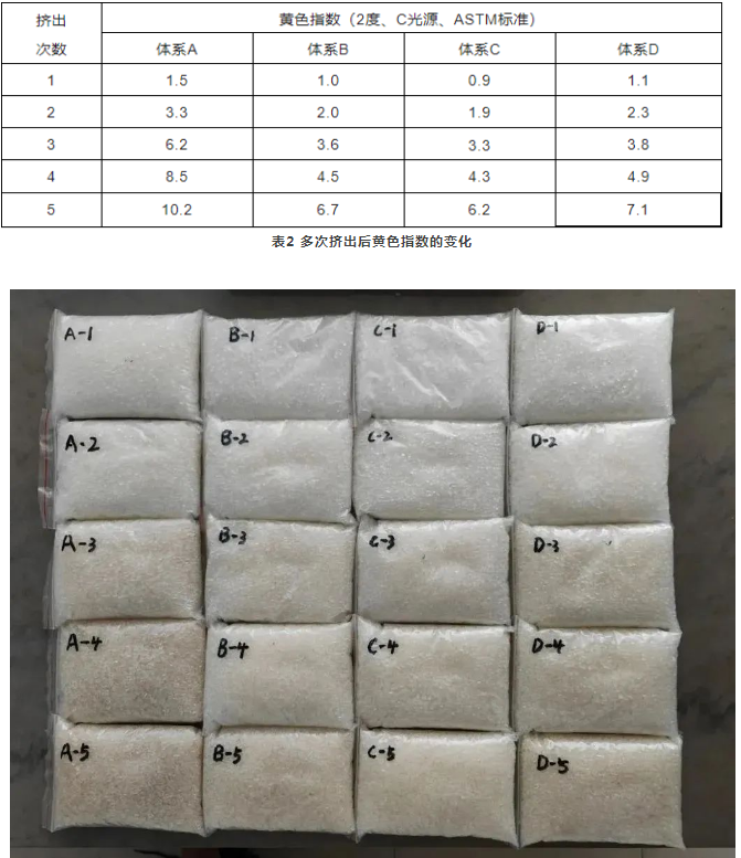 聚丙烯在加工过程中,易产生热老化现象,加入的主抗氧剂在抑制聚丙烯降解的同时形成醌类发色物,使制品颜色发黄。因此,添加抗氧剂稳定体系的聚丙烯,经多次挤出后用黄色指数的变化来评价抗氧剂对聚丙烯加工性的影响。试验结果见表2: