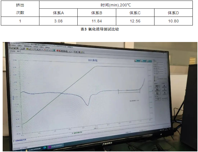 由表3可以看出,一次挤出后,氧化诱导期大小顺序为:体系C>体系B>体系D>体系A。氧化诱导期更长。说明使用此体系的PP材料热稳定性更优。